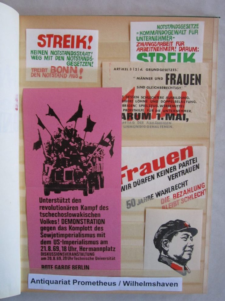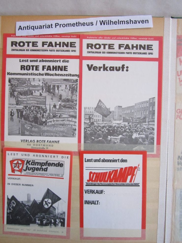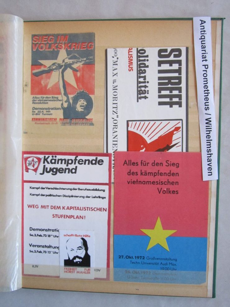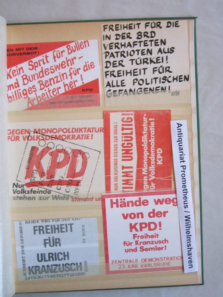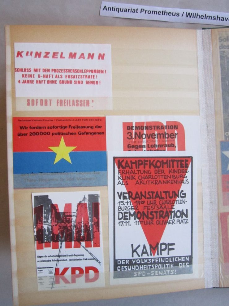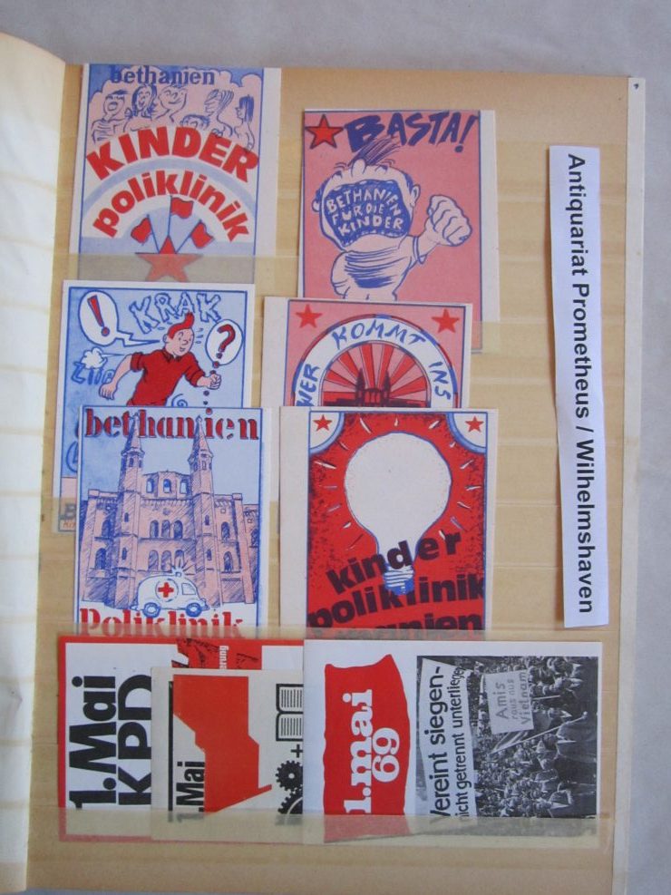 Umfangreiche Sammlung von Agitations-Aufklebern („Spuckis“), beginnend mit dem Kampf gegen die Notstandsgesetze und den Krieg in Vietnam, dann bis in die tiefste K-Gruppen-Phase der 70er Jahre. Umfaßt ca. 100 verschiedene Motive, in unterschiedlichen Formaten natürlich. Bedruckte Papieraufkleber, meist mit rückseitiger Gummirung, teils auch ohne, zumeist nicht „gelaufen“,lose gesteckt in Briefmarkenalben, sehr gut erhalten.