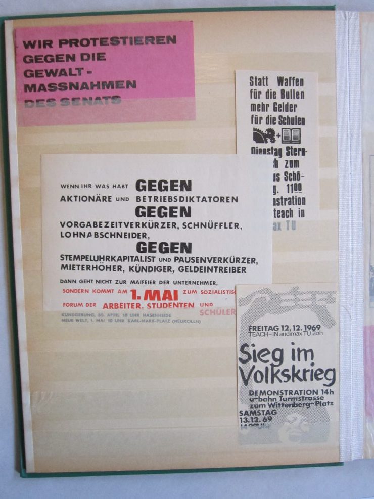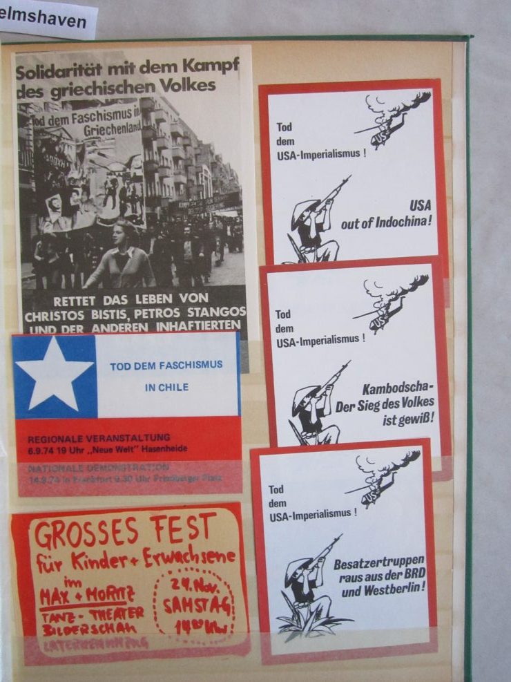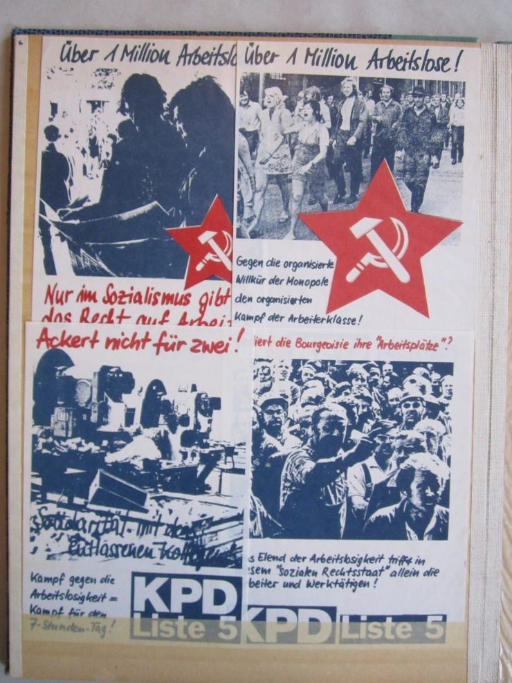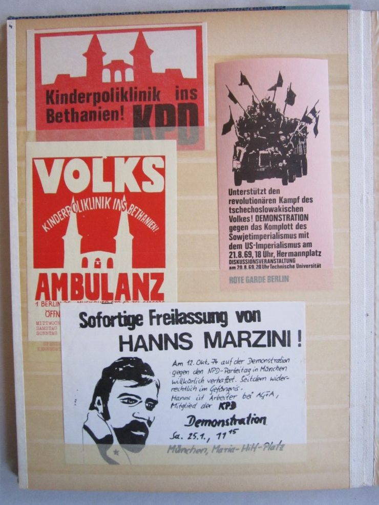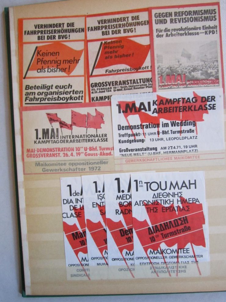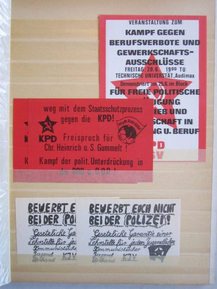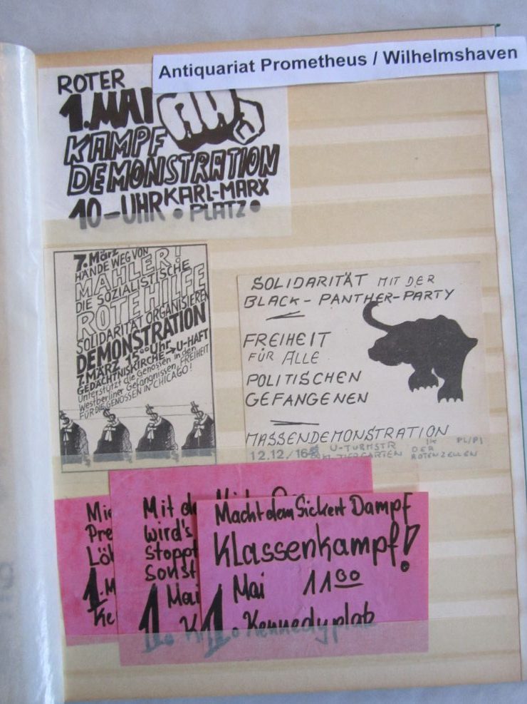 Umfangreiche Sammlung von Agitations-Aufklebern („Spuckis“), beginnend mit dem Kampf gegen die Notstandsgesetze und den Krieg in Vietnam, dann bis in die tiefste K-Gruppen-Phase der 70er Jahre. Umfaßt ca. 100 verschiedene Motive, in unterschiedlichen Formaten natürlich. Bedruckte Papieraufkleber, meist mit rückseitiger Gummirung, teils auch ohne, zumeist nicht „gelaufen“,lose gesteckt in Briefmarkenalben, sehr gut erhalten.