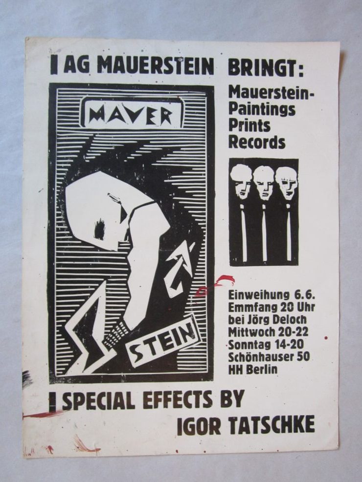 AG Mauerstein / Igor Tatschke: Mauerstein-Paintings – Prints – Records. Ausstellungsplakat der Wohnungsgalerie Jörg Deloch, Juni (1987)