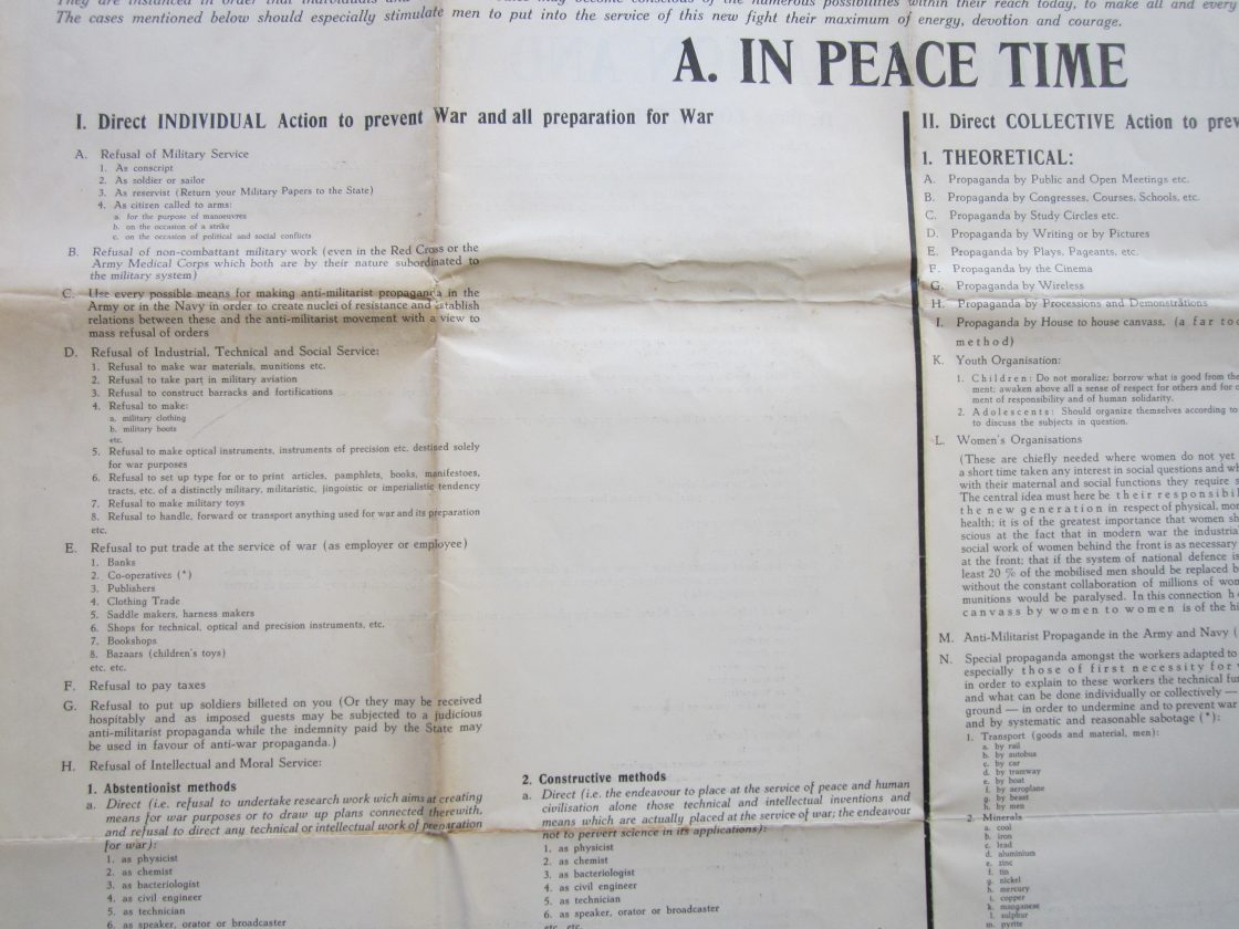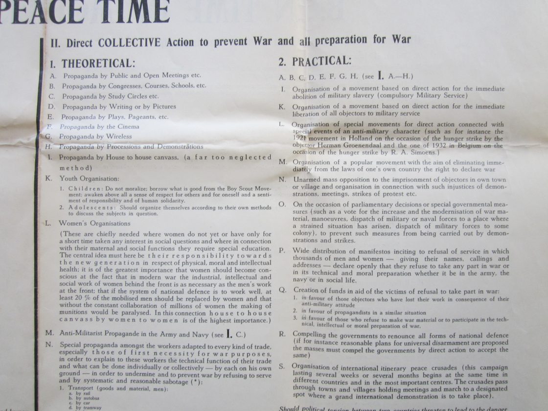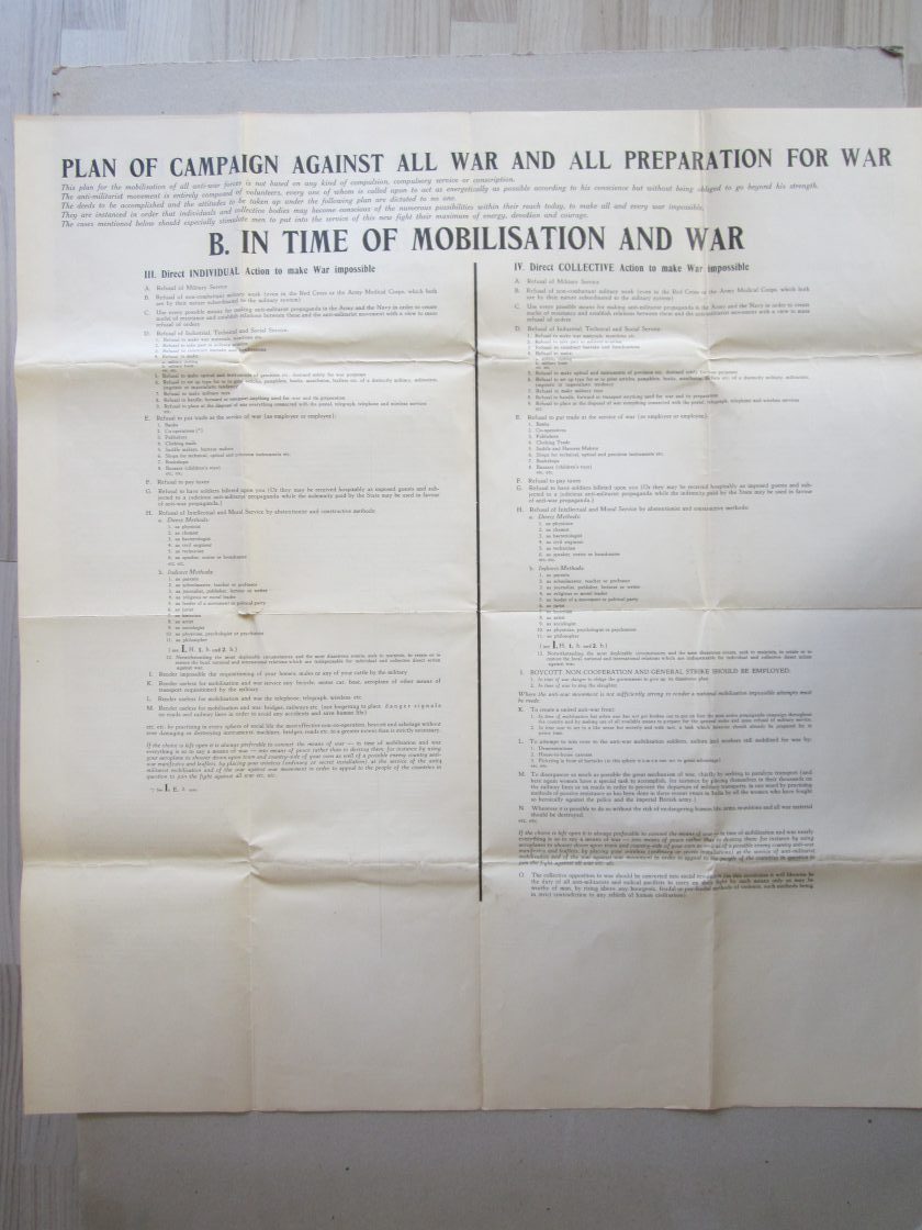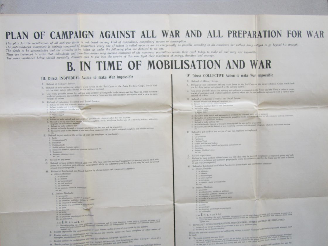 Dieser Plan für eine Kampagne wurde von Bart de Ligt verfaßt und im Juli 1934 erstmals im Rahmen einer Veranstaltung der War Resisters International in Welwyn, Herts in England präsentiert und erschien verschiedentlich in Broschüren-Form, etwa im Jahr 1939 durch die Londoner Peace Pledge Union. Der Niederländer Bart de Ligt (1883 – 1938) war Theologe und sozialistischer Anarchist und eine der prägenden Gestalten des Antimilitarismus bzw. der Friedensbewegung seiner Zeit. Das verblüffende an dem vorliegenden Plan ist sein systematischer Aufbau mit den Unterscheidungen in Friedens- / Kriegszeit / individuell-kollektiv, praktisch-theoretisch usw. Im Detail läßt sich darüber natürlich viel diskutieren, zum Beispiel wann ist eigentlich Frieden? Sind die modernen Staaten nicht ständig in Kriege involviert? Und heißt die Tatsache, das ein Staat gerade mal keinen richtigen Krieg führt, dass deswegen der Militarismus keine Rolle spielt? – aber so als Wurf ist das doch sehr respektabel. Es ist auch zu berücksichtigen, dass die Pazifistische Bewegung zur Zeit der Veröffentlichung angesichts des gesteigerten „Weißen Terrors“ und der aufgekommenen faschistischen Bewegungen in politische und theoretische Schwierigkeiten geraten war. Gegenüber der Veröffentlichung als Broschüre hat das Plakat bzw. der Wandanschlag den Vorteil, dass es ein öffentlicheres Medium ist und so eine kollektive Rezeption gefördert wird. Zum anderen ergibt sich bei dem vorliegenden Plan in dieser Publikationsform die Möglichkeit, das Plakat im Bedarfsfall einfach zu wenden.