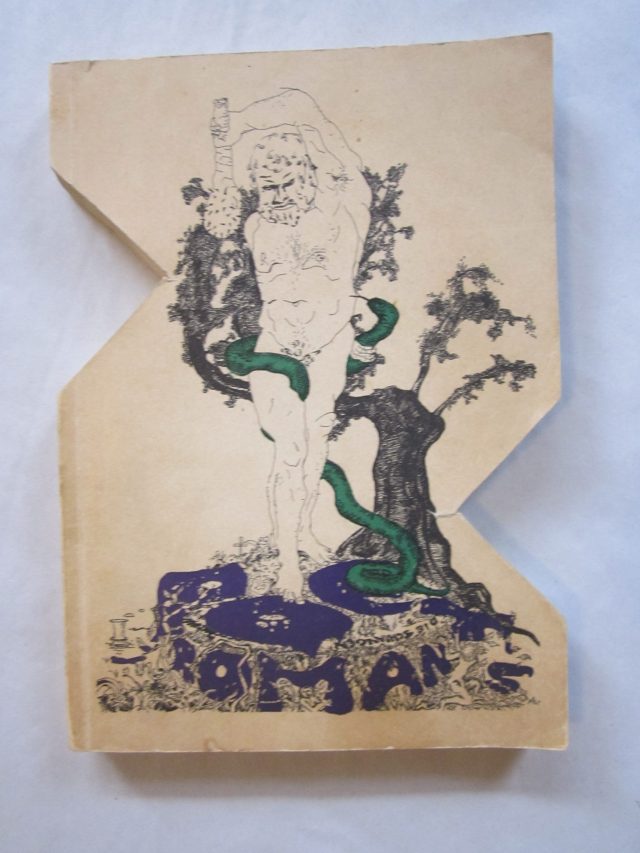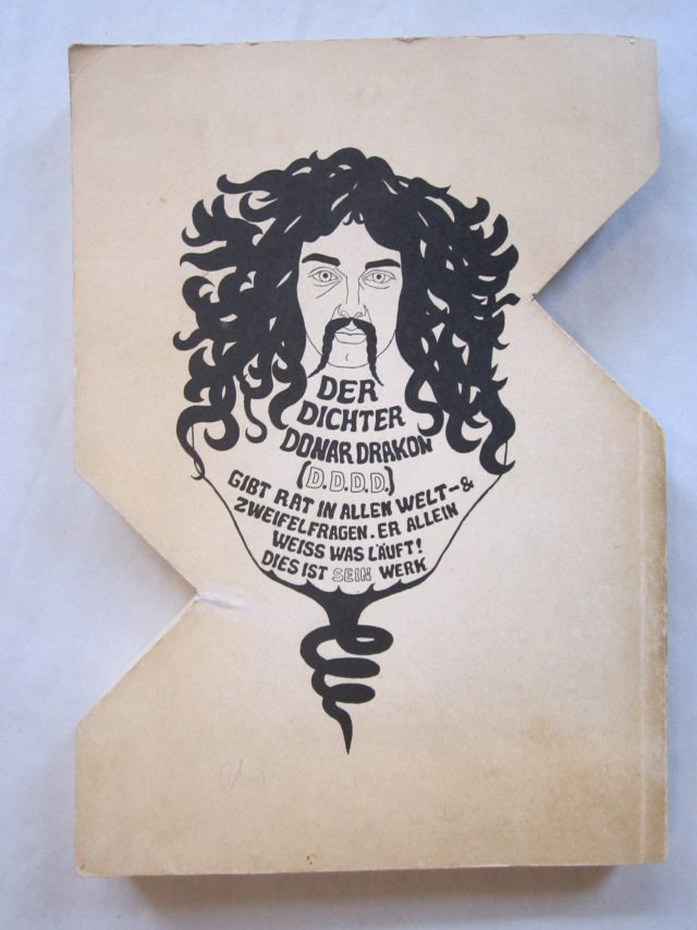 meiner Zeit als Antiquar (von einer Karriere kann man ja nicht sprechen) ist dieser Roman hier, den niemand geringeres als Donar Drakon verfaßt hat. Der Titel des Romans lautet „Roman“ – denn wie sich herausstellt, heißt Roman auch die Hauptfigur der Erzählung -, der Untertitel „Roman des Dichters Donar Drakon“, und Donar Drakon heißt, jedenfalls lauf DNB, Kurt Hilger Konrad. Erschienen das Buch, und das hätte man nun nicht vermutet, im Universitätsverlag Bochum. Als herausgebende Körperschaft firmiert eine „Neue Goebbels-Gesellschaft Bochum“. Der NS taucht im Buch noch verschiedentlich auf, so erscheint dem Autor Hitler in einer Vision. Die graphische Gestaltung erinnert an ein Haschisch-Kochbuch, und so eines habe ich auch mal gehabt, aber vielleicht nur in Kopie, daran fehlt mir die Erinnerung. Die Rezepte waren sowieso unbrauchbar, denn woher nimmt man 60 Gramm Roter Irgendwas für ein Gläschen Marmelade? Der Autor, also Donar Drakon, hat sicher alles ausprobiert, was es so für body und soul gibt, und wer wollte das kritisieren, wenn so ein Buch dabei herauskommt? Zu bedenken ist aber, was Hunter S. Thompson mal zum Thema schrieb, und der kannte sich damit ja wirklich aus: Bewußtseinserweiternde Drogen verlieren ihren Sinn, wenn man erstmal begriffen hat, dass da draußen niemand ist. Aber da war er auch schon älter.
