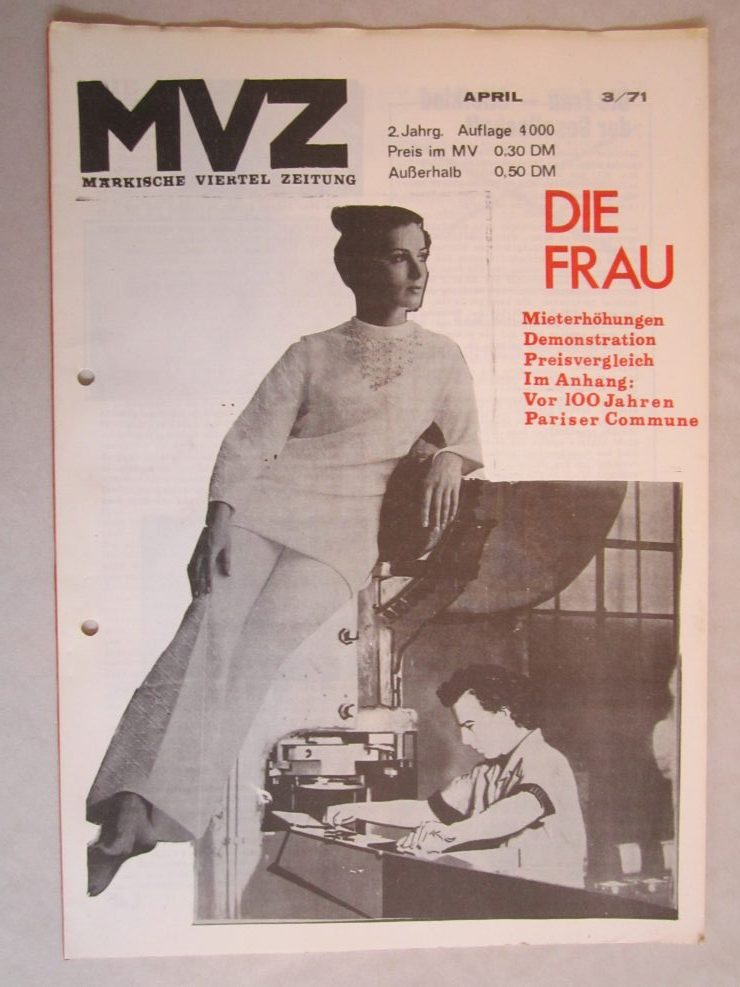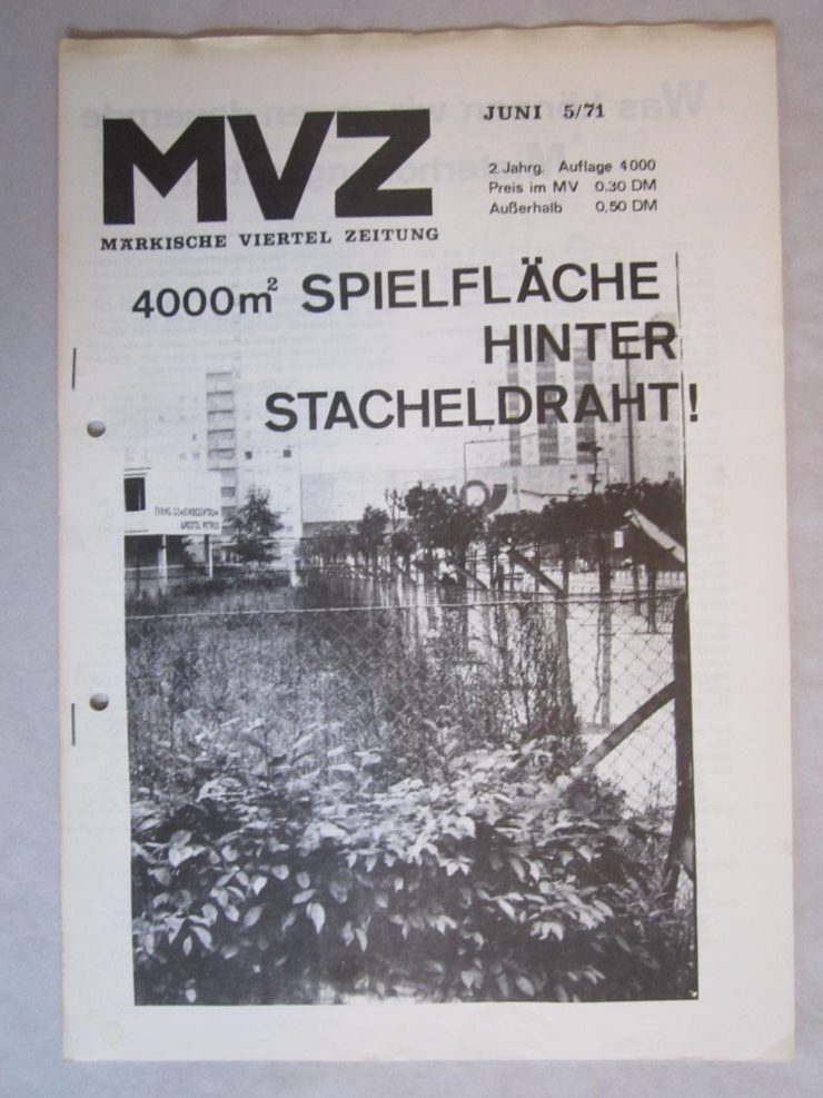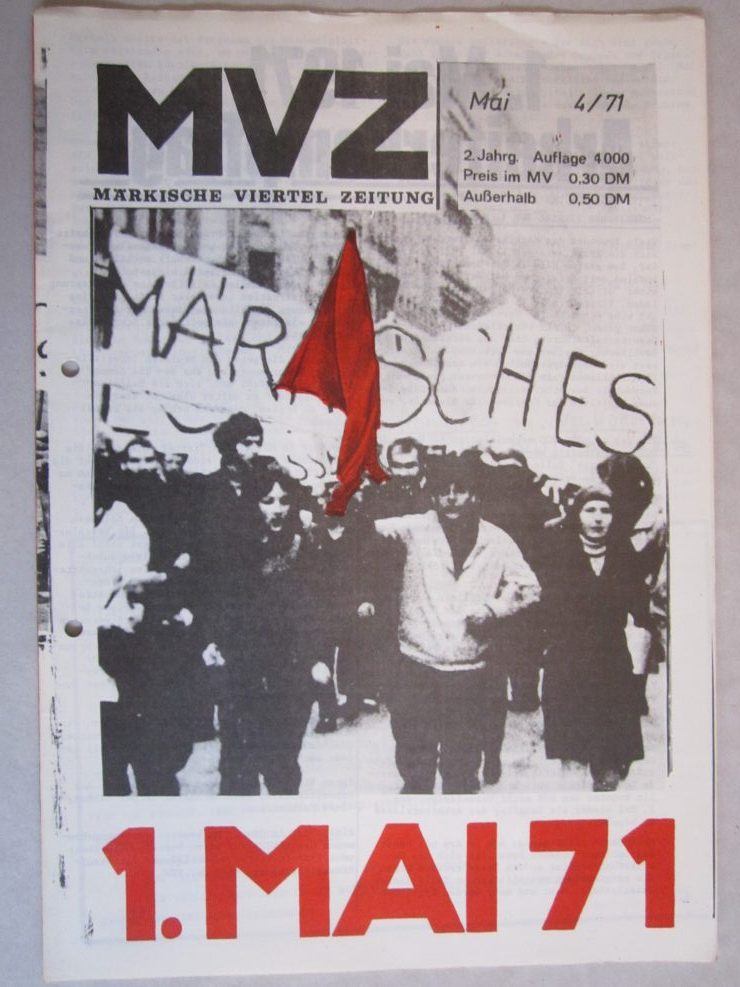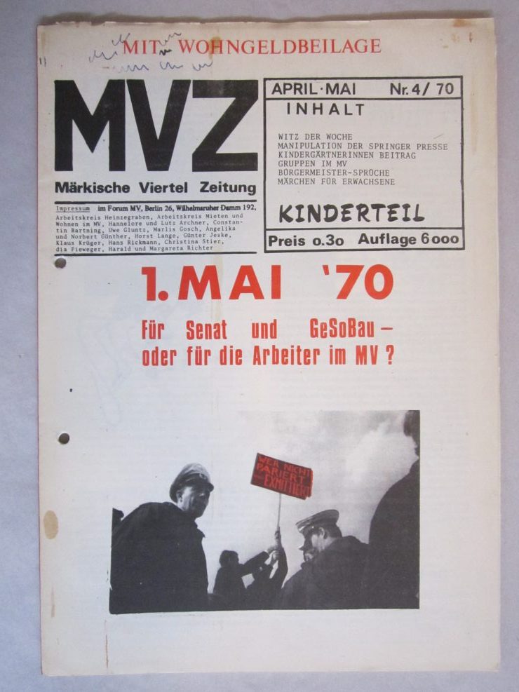 1968 geschah nun Erstaunliches: die sowieso schon revoltierenden Studierenden etwa des Architektur-Fachbereichs der TU entdeckten das Thema, das dann auch großen Raum erhielt bei einer interessanten, mehr oder minder informellen Ausstellung am Fachbereich (Titel: „Diagnose“). BewohnerInnen des MV wurden zu Uni gebracht, Sudierende fuhren raus, und es entstand in den folgenden Jahren eine außergewöhnliche Muschung aus Uni und Protest. Neben denen von der Architektur waren v.a. Studierende der PH (Pädagogische Hochschule) beteiligt, von denen allein im Rahmen eines Projekts rund 100 ins MV schwärmten. Dabei ging sicherlich auch um die zu erwerbenden Scheinchen („Leistungsnachweise“), und nach Vollendung der Arbeit sind viele Studentchen dann eben wieder verschwunden. Es gab aber auch andere, bei denen das Engagement authentisch war, wie etwa die später als Filmemacherin bekannt gewordene Helga Reidemeister und andere, die später die Politfilm-Firma „Basisfilm“ gründeten, und sicher etliche andere mehr. Jedenfalls ergab sich ein Gemenge aus protestierenden BewohnerInnen und mehr oder minder bewegten Studierenden, das von Beginn an auch von Konflikten durchsetzt war, was sich durch die einsetzende Verwandlung in eine marxistisch dominierte Politgruppen-Szenerie vermutlich nicht besserte. Aber, es gab die Proteste, und wer sich damit beschäftigt, wird auch viel Interessantes finden, nicht nur was Protestformen angeht. Eine wichtige Quelle hierfür ist die Zeitschrift MVZ, von der hier ein Konvolut an bieten (s.u.). Zur Zeitung ist schon damals eine Art Dokumentation erschienen: