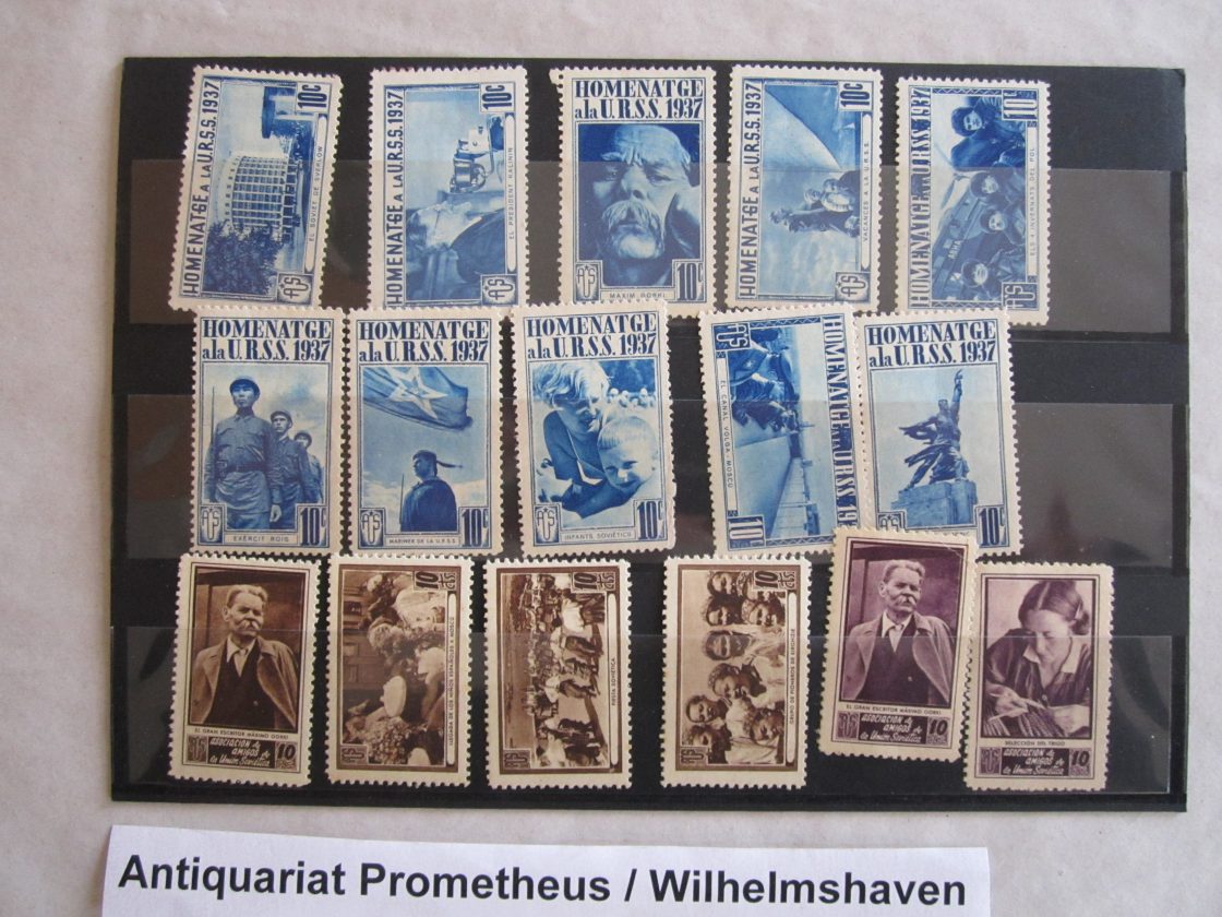 In das Jahr 1937, als man auf Seiten der Repubik noch Hoffnungen hatte, fiel nun auch der 20. Jahrestag der Oktoberrevolution, also im weiteren Sinne auch der Sowjetunion. Diesem Ereig nis ist auch im republikanischen Spanien große Aufmerksamkeit gewidmet worden, schließlich war die Sowjetunion, abgesehen von Mexiko, der einzige Staat, der die Republik mit Waffen etc. unterstützte, wenn auch alles andere als uneigennützig. Darüber ist schon viel geschrieben worden, die vorliegenden Marken brauchen so nur als Hinweis auf die herausgebende Gruppierung lenken, der eine bedeutende Rolle in der pro-sowjetischen Propaganda in Spanien zukam. Angeboten sind hier 10 Marken einer so vermutllich kompletten Serie in Blau, dazu 4 und 2 einer anderen Serie, die offenbar in (mindestens) zwei Farben gedruckt wurde. Der arme Gorki, damals schon zwei Jahre tot, ist so gleich doppelt da, und oben ist er gleich nochmal, mit dem berühmen Schnauzbart. Bmerkenswert bei diesen Marken ist die Verwendung von Fotos als Vorlage und die hervorragende Druckqualität. Nun ja, es war den sowjetischen Beratern und ihren Verbündeten eben gelungen, die entsprechenden Ressourcen zu belegen. Kunststück, wenn man da mit sieben Geheimdiensten aktiv ist und der örtlichen Bourgeoisie den Schutz des Privateigentums verspricht…