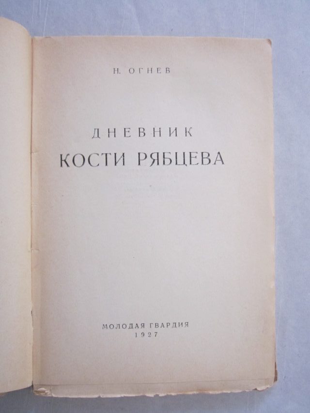 Erste Ausgabe, erschienen in 5000 Exemplaren. Einbandgestaltung von G. M. Schegal. Fiktive Tagebuchaufzeichnungen. Ein berühmtes Buch, das bereits 1928 ins Deutsche übersetzt wurde (Tagebuch des Schülers Kostja Rjabzew) und fortgesetzt wurde (Kostja Rabzew auf der Universität.). Vorderdeckel links unten mit kleinerer Fehlstelle, unbeschnitten, etwas gebräunt / angeschmutzt, insgesamt gut erhalten. (EUR 150,-)