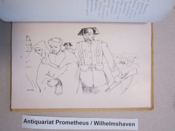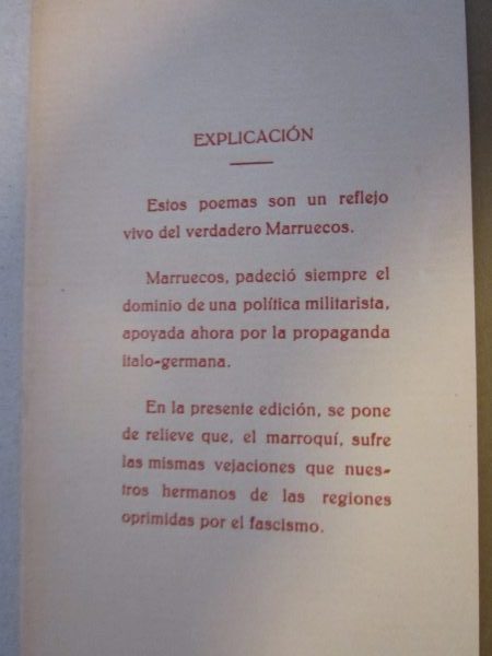 Zu den wirklich erstaunlichen Funden meiner Arbeit gehört ein dünnes Heft aus dem Jahr 1937, veröffentlicht von einem Secretario de Propaganda A. A. Hispano Marroquí, in Valencia, also vor dem Hintergrund des Spanischen Bürgerkriegs, und zwar von Seiten der Republik. Es enthält Gedichte, die einerseits das soziale Elend in Spanisch-Marokko zum Gegenstand haben, zum anderen solche, die den Einsatz marokkanischer Söldner auf Seiten der Putschisten um Franco thematisieren und sich auch direkt an diese richten. Sie, die Söldner, sollten sich nicht von den Faschisten instrumentalisieren lassen und vielmehr zu Hause gegen das Elend und für die Freiheit kämpfen. Neben den Gedichten enthält der Band zehn ganzseitige Reproduktionen von Zeichungen von Crestar – der uns aus der CNT-FAI-Frontzeitung „El Parapeto“ bekannt ist-, jeweils durch ein transparentes Blatt geschützt, also relativ aufwendig produziert. Das „A.A.“ im Namen der herausgebenden Gruppe steht laut WorldCat für „Agrupación Antifascista“, weitere Publikationen sind aber dort nicht nachgewiesen, jedoch handelt es sich bei unserem Exemplar laut Umschlag um eine 2. Auflage.