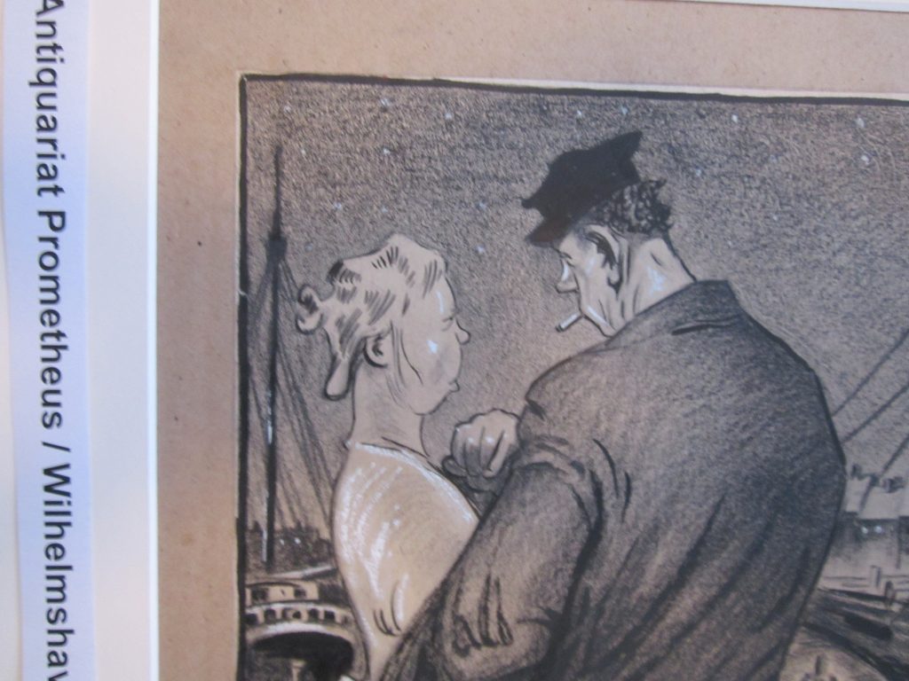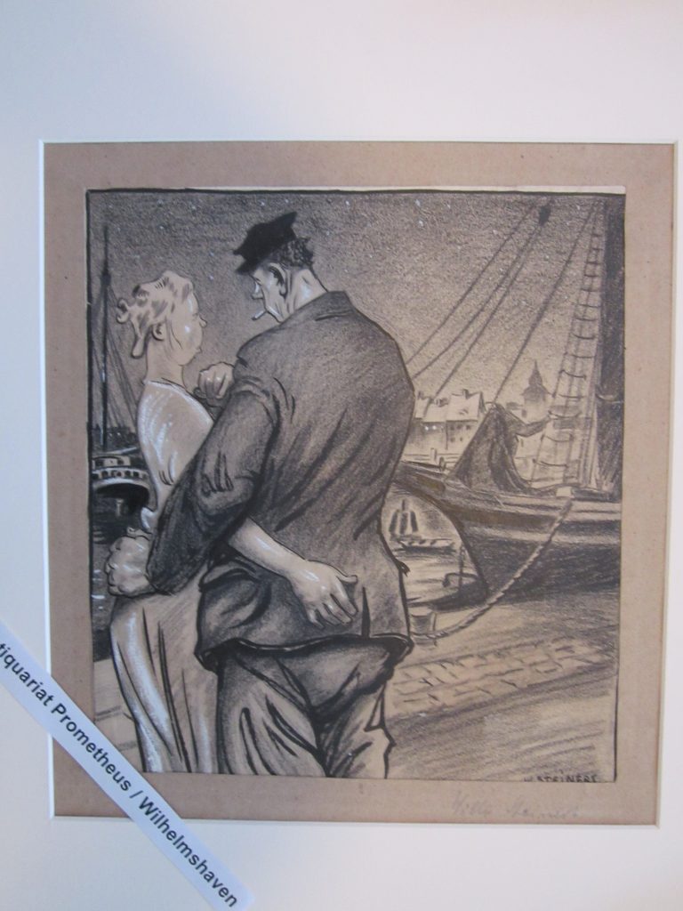 Willi Steinert: Von der Wasserkante: „Macht Ihr zu Hause dieses Jahr keine Schweine fett, Greta?“ / „Nä, wir nehmen lieber Sommergäste, das macht nich soviel Arbeit.-“ Kohle / Bleistift, weiss gehört, auf leichtem Karton. Format 26 x 23 cm, mit altem Papierpassepartout, neu montiert unter Passepartout 50 x 40 cm. Rechts unten zweimal von Hand signiert, einmal auf dem Blatt selbst, dann noch auf dem Papierpassepartout. Dort auch mit Adreßstempel Steinert, der damals also in der Leibnizstr. 86 in Berlin-Charlottenburg lebte. Verso in Bleistift betitelt, aber durchgestrichen Sehr guter Zustand. EUR 250,-