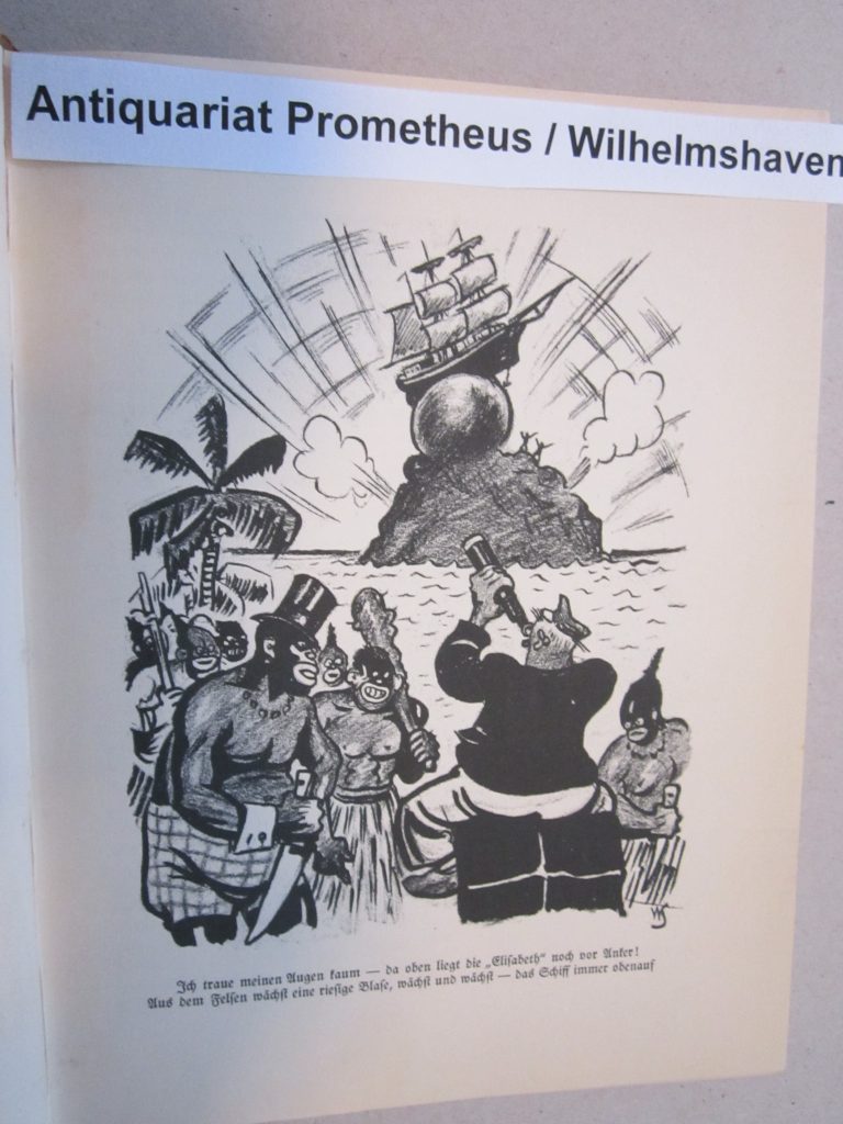 Ein kurzer Blick in „Seebär – ahoi!“ zeigt klassisches Seemannsgarn, phantastische Begebenheiten, bei denen Gin und andere Spirituosen sozusagen immer an Bord sind. Inwiefern letzteres Steinert gut bekommen ist darf bezweifelt werden, hatten wir doch mal ein drittes Blatt von ihm, das in zahlreichen kleinen Szenen die Tücken des Teufels Alkohol verdeutlicht. (Das ist aber schon weg) Dazu enthält das Buch eine Fülle von Illustrationen, von denen manche aber, etwa die zu in Afrika spielenden Geschichten, heute vielleicht so nicht mehr erscheinen würden. Andererseits geht es z.B. bei der ersten Geschichte auch um einen Streik der schwarzen Stauer, was ja wieder schön sozialdemokratisch ist. Typisierungen scheinen aber sowieso ein Grundproblem gezeichneter Satire zu sein. (Das wäre mal eine Frage an die Profis…)
